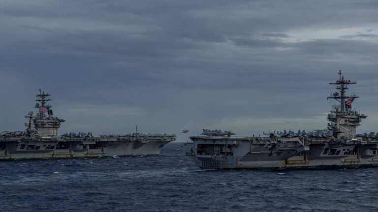 The two carrier strike groups entered the South China Sea to conduct “dual carrier operations in the Indo-Pacific in support of maritime security operations and theater security cooperation efforts.”