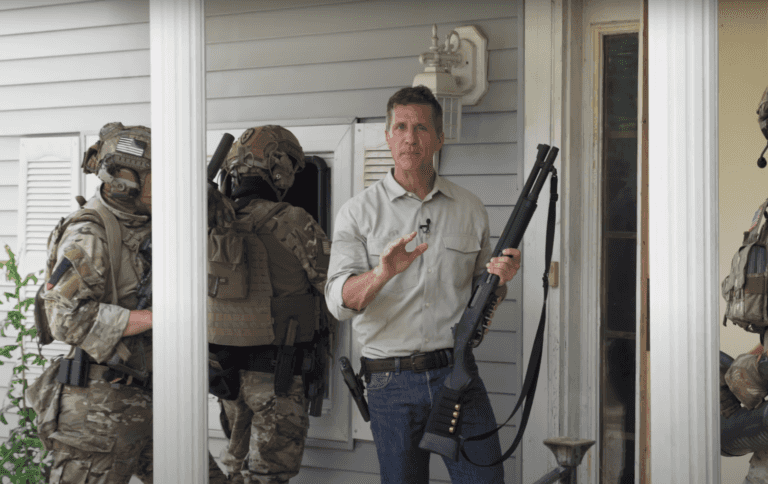 Eric Greitens, a U.S. Navy SEAL veteran and Navy Reserve officer now running in the Republican primary to replace retiring Sen. Roy Blunt (R-MO), released a new campaign ad on Monday in which he and a group of men with rifles and tactical gear storm into a house as he calls for viewers to hunt “RINOs.”