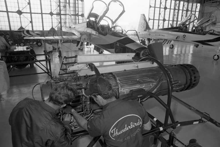 Twenty-one pilots have been killed in the squadron’s history, but only three crashes have occurred during shows. In 1982, four planes crashed nose first at the Indian Springs Air Force Auxiliary Field in an accident known as the Diamond Crash. The pilots were training for an air show when the planes failed to turn up from a loop soon enough to avoid impact. All four pilots involved in the training died.